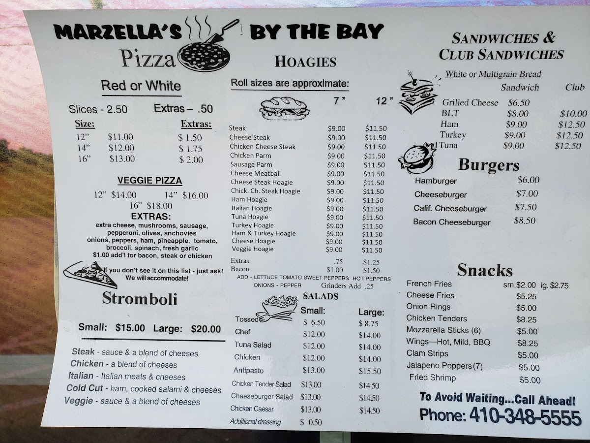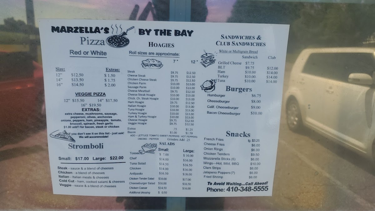Introducing Marzella's By The Bay LLC, your go-to spot in Betterton, MD, for an unforgettable culinary experience. Nestled at 3 Howell Point Rd, this establishment offers a cozy atmosphere, perfect for takeaway lovers. Patrons rave about the **pizza**, with one customer declaring it the "best pizza place hands down," thanks to its fresh and flavorful ingredients.